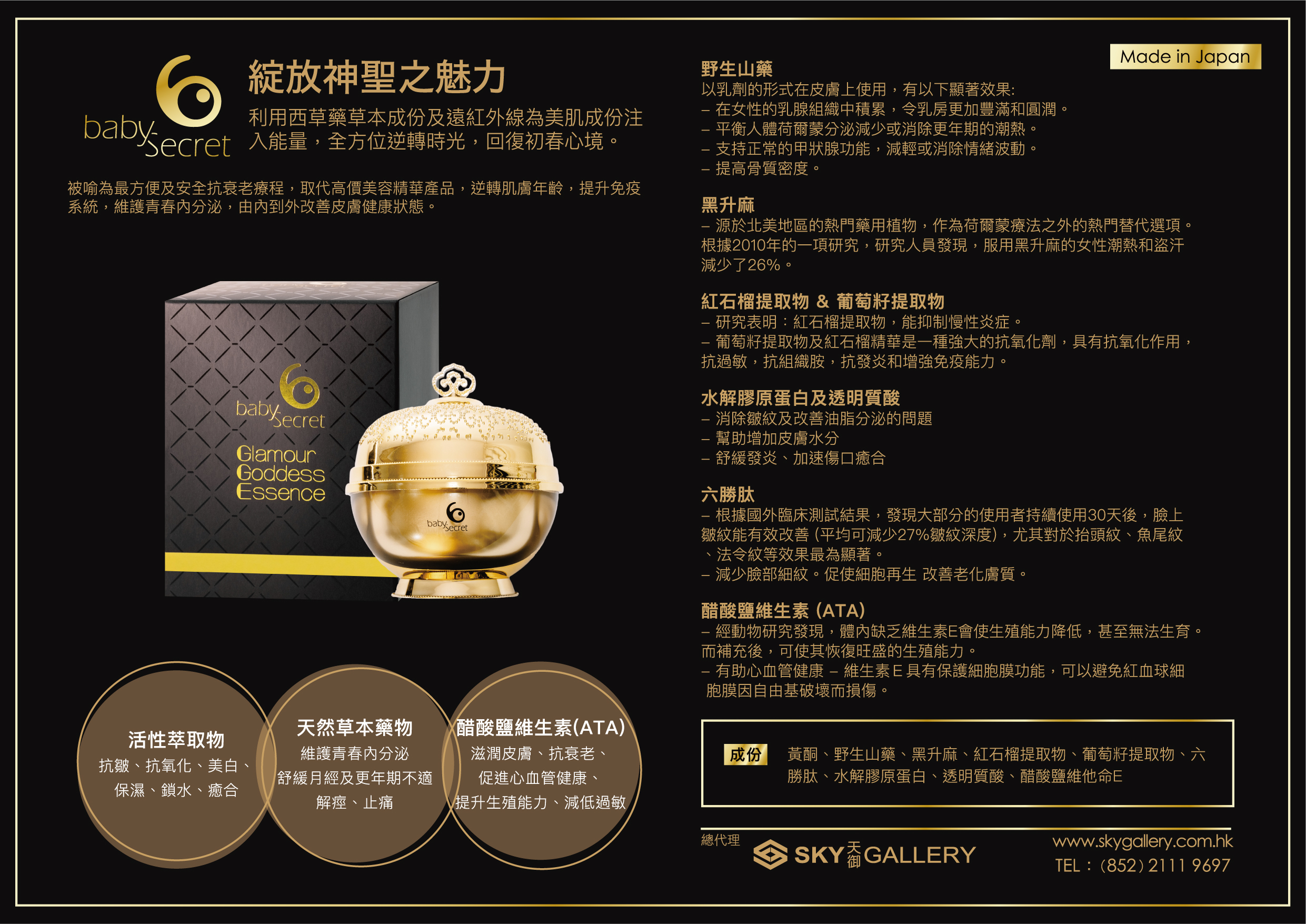 包括野生山藥、黑升麻、紅石榴萃取物、葡萄籽萃取物、南方鹽維他命ATA 、六勝肽等